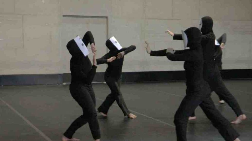 Chaque participants est amené à explorer et pousser la dimension grotesque de cette danse macabre en jouant de l’organisation spatiale des postures et du contraste des registres de tension, d’une grande vélocité d’exécution ou, à l’inverse, d’une extrême lenteur.